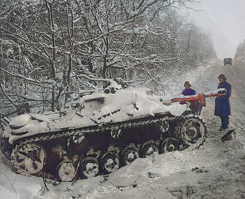Deutsche Panzer und Selbstfahrlafetten in winterlicher Schneetarnung. Hummel, Nashorn, Stug III, Sdkfz. 250/9, Wespe, Panzer III. Wehrmachtstruppen in Winteruniformen. Gute Nahaufnahme der Nashorn-Flugabwehr-Maschinengewehrhalterung.