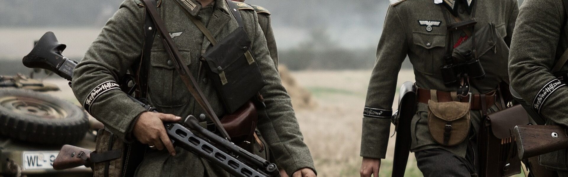 | Eine Sammlung deutscher Militärausrüstung, darunter Artilleriegeschütze, Suchscheinwerfer, Panzer und Lastwagen auf dem Solar-Flugplatz in Stavanger. |